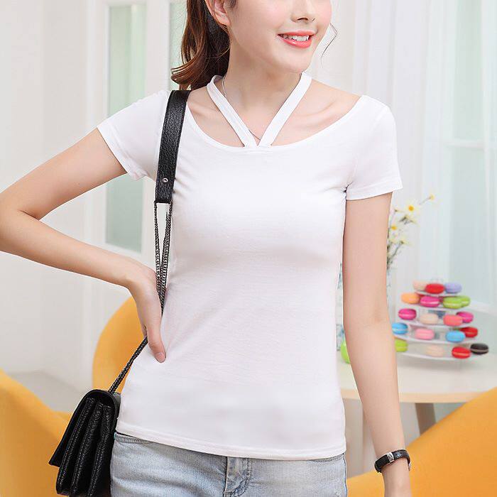 ins潮chic港风上衣夏季大码半袖挂脖交叉露肩锁骨短袖t恤女设计感热门设计联盟服务商