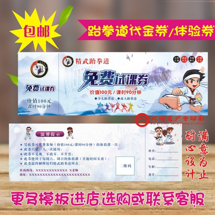 跆拳道馆体验卡代金券免费设计双面印刷二维码试课卡定制广告。热门设计联盟服务商