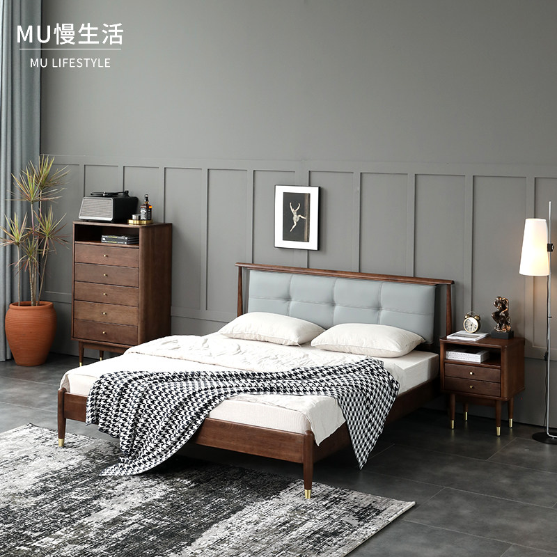 北欧实木床轻奢艺术软包家用现代简约1.5米双人床1.8米黑胡桃木色热门设计联盟服务商